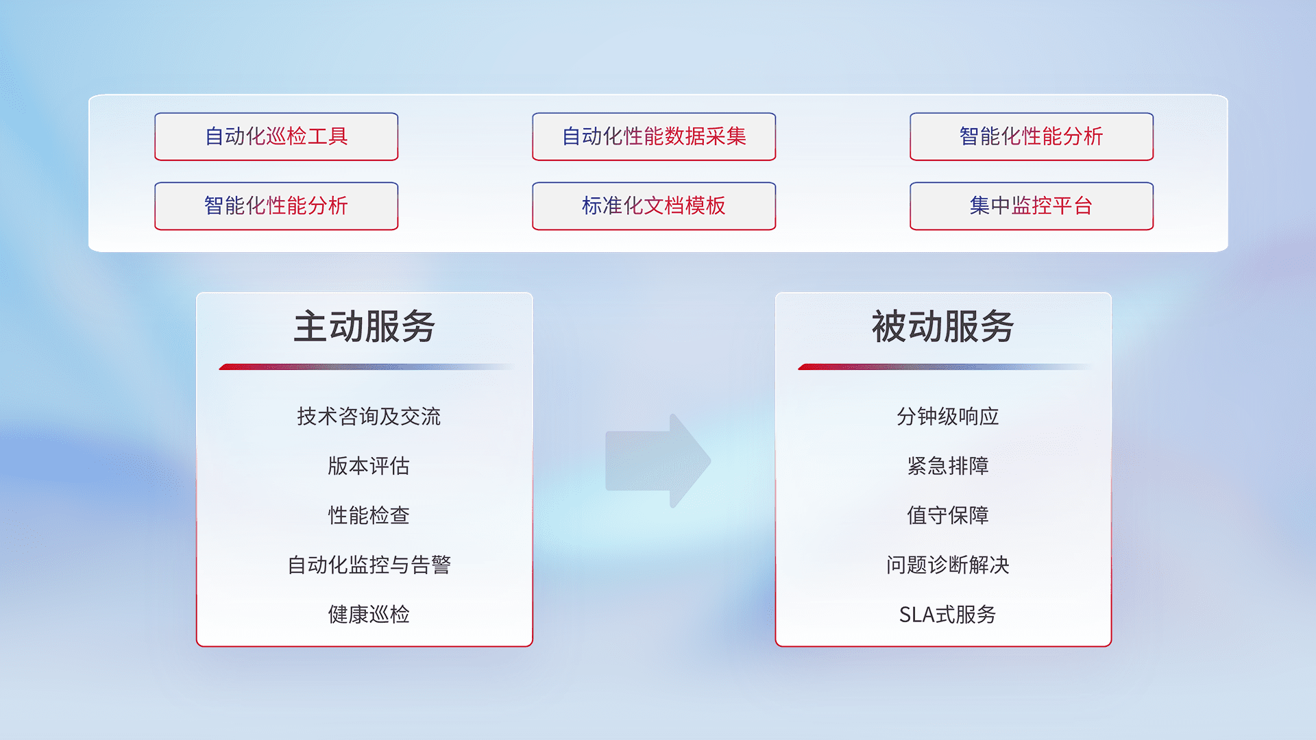 智能化工具和标准化文档,,,,保障服务质量,,,,提供主动服务(包含技术咨询、、版本评估、、性能检查、、自动化监控与告警、、、、健康巡检)和被动服务包含(分钟级响应、、、紧急排障、、、值守保障、、、问题诊断解决、、SLA服务)。。
